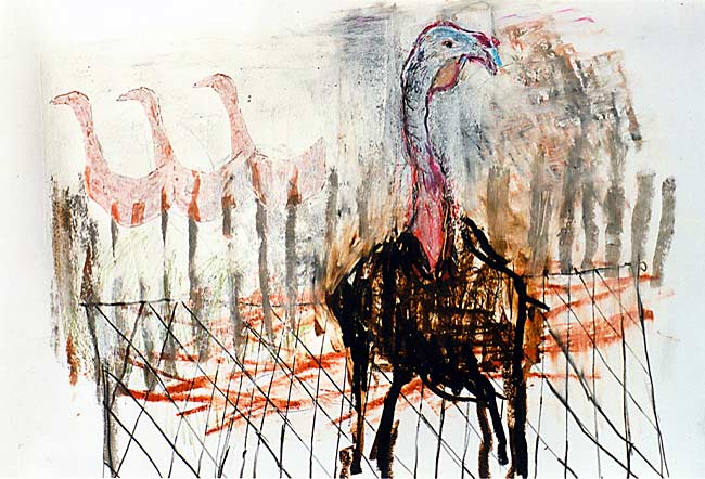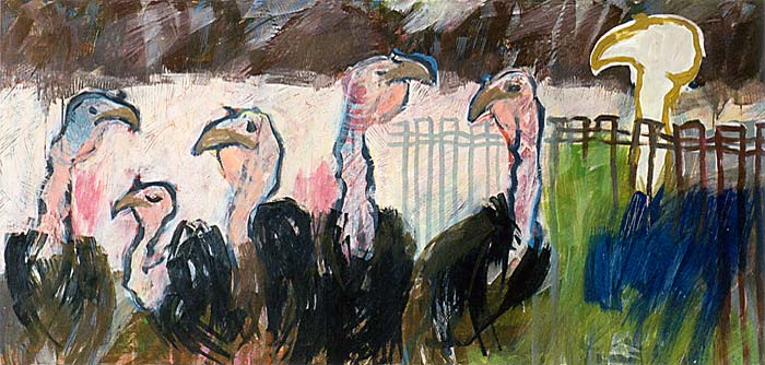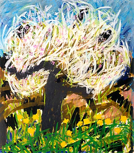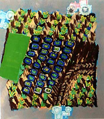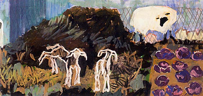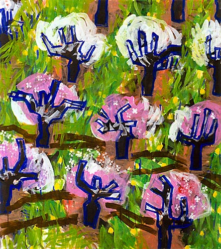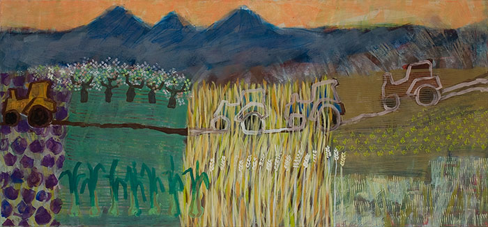Der Pflug gräbt tiefe Spuren in die Erde. Krähen tauchen auf, in kleinen Gruppen hüpfen sie suchend über die Erdschollen. Blaue Kisten stapeln sich an den Feldrändern. In der Ferne ziehen lautlos Traktoren geduldig von einem zum anderen Feldrand, folgen damit einer alten Ordnung. Obstbäume stehen in geordneten Reihen, manchmal tragen sie blaue Strümpfe.